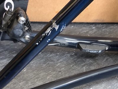 落車だけでなく倒れただけで…割れることもある軽量フレームであればかなり薄いものだから倒れて打ちどころが悪ければこうしたことに…決して特別なことではありません。細いシートチューブの破損はかなり多めです。昨今の高級フレームなら修理するのはごく当然な流れになっています。大事なのは治れば良いのでなく、カーボンシート巻き巻きで剛性が高くなりすぎたり、見た目がブ...